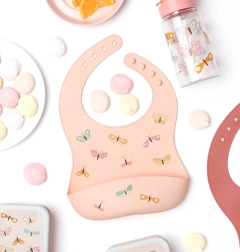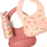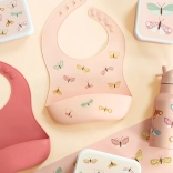 - 2× silikonowy śliniak (1× z motywem motylków, 1× jednokolorowy)