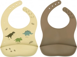 Praktyczny zestaw dwóch silikonowych śliniaków dla wygodnego i czystego jedzenia – jeden z wesołym motywem dinozaurów, a drugi w jednolitym kolorze. Śliniaki są wodoodporne, łatwe do czyszczenia, z głęboką kieszenią na okruszki i regulowanym zapięciem dla idealnego dopasowania.