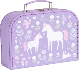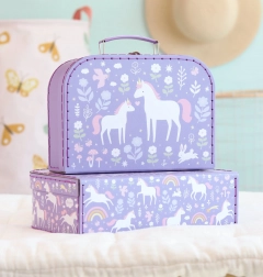 Zestaw dwóch dekoracyjnych kuferków od A Little Lovely Company oferuje radosny design z jednorożcami, tęczą i kwiatami na fioletowym tle. Lekka, a jednocześnie solidna konstrukcja z wytrzymałego kartonu z wysokiej jakości przeszyciem gwarantuje długą żywotność i wygodne przenoszenie.