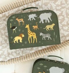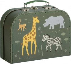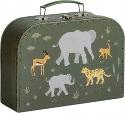 Stylowy zestaw dwóch tekturowych kufrów ze wzorem zwierząt z sawanny ucieszy zarówno dzieci, jak i rodziców. Oferuje praktyczne przechowywanie zabawek i artykułów plastycznych, wykonany jest z wytrzymałej tektury z solidnymi metalowymi uchwytami i zapięciem dla bezpiecznego zamknięcia.
