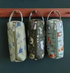 Stylowy zielony piórnik na kredki z nadrukiem dinozaurów z trwałego, zrównoważonego poliestru. Praktyczne zapięcie na zamek, podszewka i wygodny uchwyt bezpiecznie utrzymują przybory do pisania w domu, w szkole i w podróży.