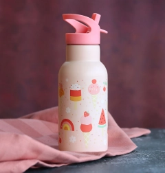 Stylowa stalowa butelka dla dzieci z motywem lodów o pojemności 350 ml dłużej utrzymuje napoje świeże dzięki podwójnej ściance z izolacją. Praktyczna ustnikowa pokrywka ze słomką do zimnych napojów oraz wytrzymałe materiały gwarantują wygodne i bezpieczne użytkowanie w domu, w szkole i w podróży.