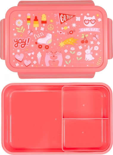 Urocze pudełko na śniadanie w koralowo-różowym kolorze z motywem zabawy jest idealne do szkoły i na wycieczki. Ma hermetyczną pokrywkę na zatrzask oraz wyjmowaną tackę z dwiema przegródkami dla przejrzystej organizacji posiłku. Lekkie, trwałe i gotowe na różnorodne lunche, które dzieci uwielbiają.