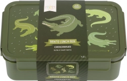 Praktyczne pudełko na drugie śniadanie z nadrukiem krokodyli idealnie sprawdzi się w szkole i na wycieczkach. Ma hermetyczną, zatrzaskową pokrywkę oraz wyjmowany pojemnik z dwiema przegródkami, dzięki czemu przekąski pozostaną świeże i przejrzyście uporządkowane przez cały dzień.