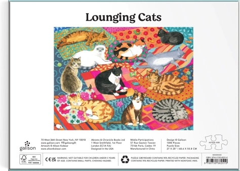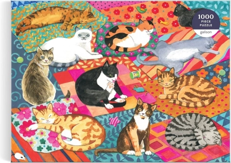 Zrelaksuj się z pięknymi puzzlami GALISON z motywem ilustratorki Alison Kolesar. Układanka z 1000 elementów przedstawia urocze koty na kolorowych narzutach i poduszkach, wykonana z materiałów z recyklingu, z matowym wykończeniem, nietoksycznymi tuszami i wysokiej jakości nadrukiem dla żywych kolorów i detalu.
