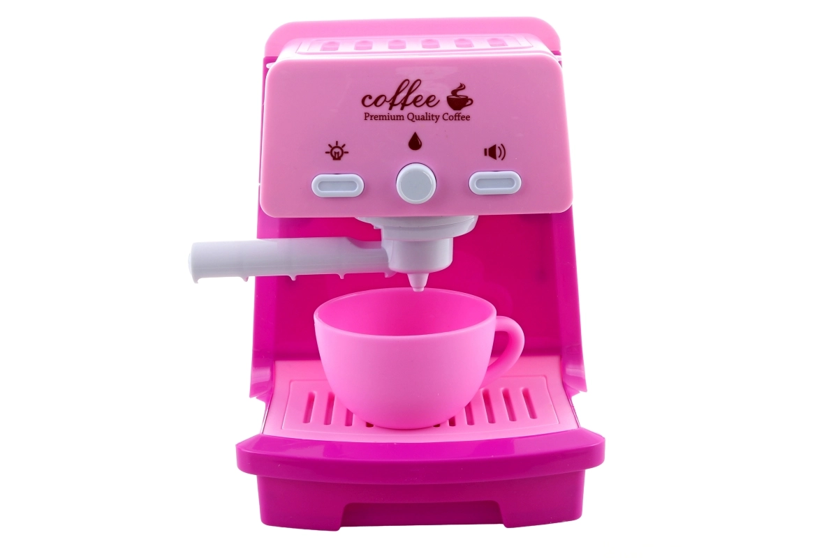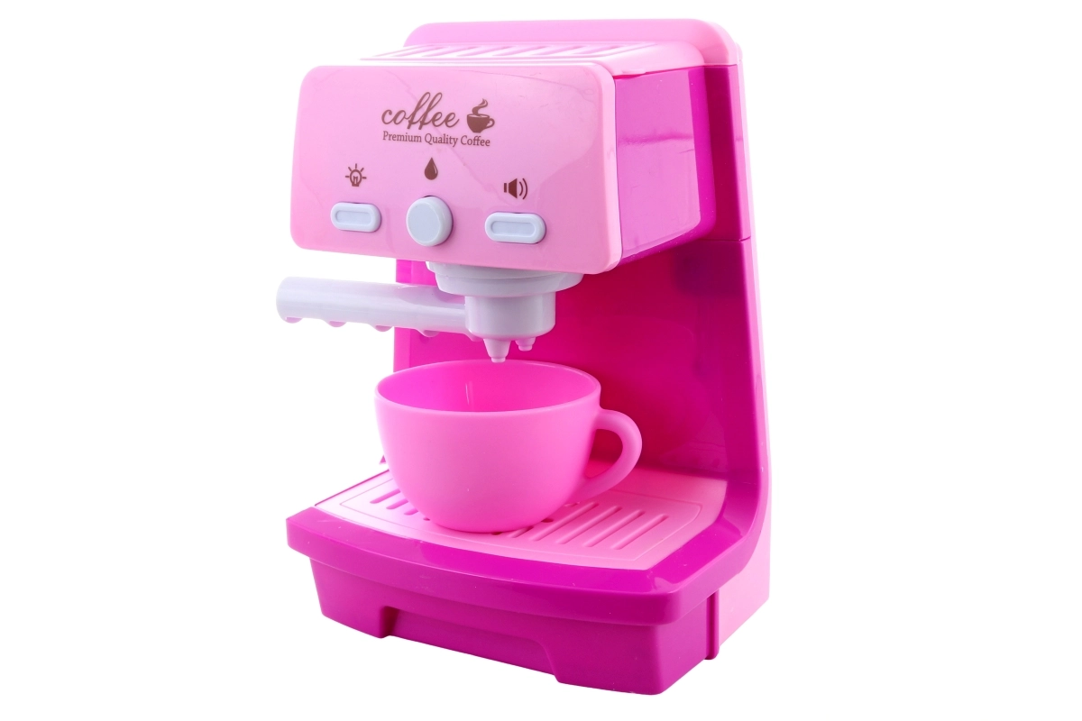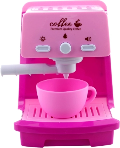 Dziecięcy ekspres do kawy z efektami świetlnymi i dźwiękowymi, portafiltrem i filiżanką. Do zbiornika można nalać wodę i ręcznie ją przepompowywać – jak przy prawdziwym parzeniu espresso.