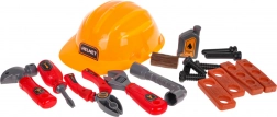 Komplet zawiera 37 elementów, w tym kask, piłę tarczową i wiele innych narzędzi, które wyglądają jak prawdziwe.