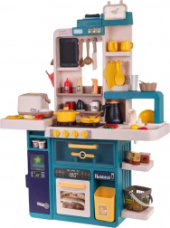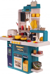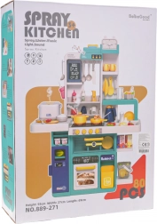 W zestawie znajdują się także otwierana lodówka i piekarnik, praktyczne półki do przechowywania żywności i naczyń, tabliczka kredowa na listy zakupów lub przepisy oraz panel muzyczny z melodiami i dźwiękami okapu. Parowar do ryżu dodatkowo wytwarza parę i autentyczne dźwięki. Cały zestaw to 80 elementów akcesoriów na długie godziny zabawy.