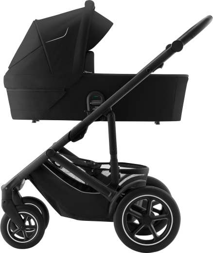 Zestaw w kolorze Space Black obejmuje wszystkie potrzeby od urodzenia do wieku przedszkolnego. Wózek SMILE 5Z ma amortyzowane, odporne na przebicie koła, obrotowe siedzisko spacerowe przodem lub tyłem do kierunku jazdy, ekstra długą budkę z UPF 50+ oraz elementy odblaskowe 360° dla bezpiecznych spacerów w mieście i w terenie.