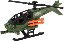 Zielony wojskowy helikopter z czarnymi wirnikami i pomarańczowymi pociskami wyróżnia się realistycznym wyglądem, który sprzyja emocjonującym scenariuszom zabawy.