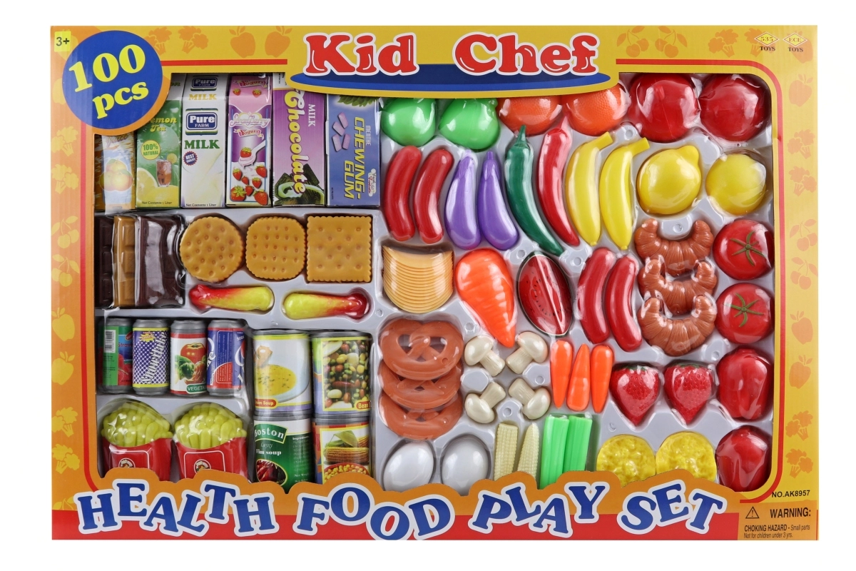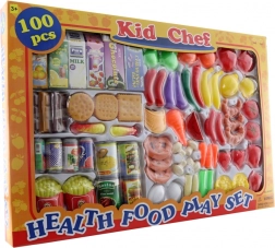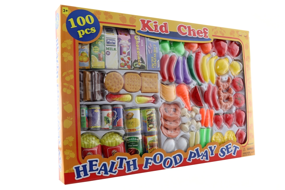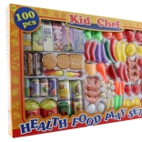 Duży zestaw jedzenia. Opakowanie zawiera łącznie 100 elementów (owoce, warzywa, pieczywo, słodycze, puszki i napoje w kartonie). Wymiary opakowania ok. 58×39×5 cm. Wiek 3+