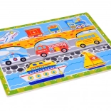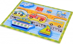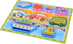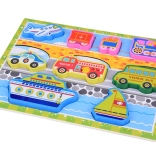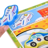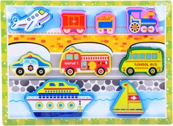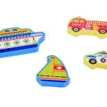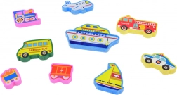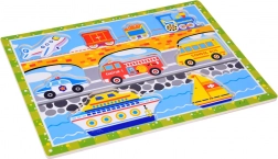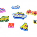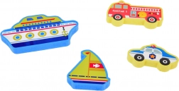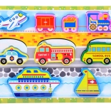 Zawiera różne pojazdy, takie jak autobus szkolny, wóz strażacki, samolot i inne.