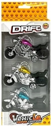Motocykle mają napęd frykcyjny: wystarczy je naciągnąć do tyłu po podłożu, a ruszą do przodu. Idealne do wyścigów, swobodnej zabawy i jako dekoracja do pokoju dziecięcego. Zapakowane w pudełko z przezroczystym okienkiem, więc zestaw jest gotowy na prezent.