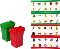 Dwa kosze i realistyczne przegrody zachęcają dzieci do zrozumienia recyklingu i odpowiedzialnego podejścia do przyrody.