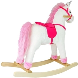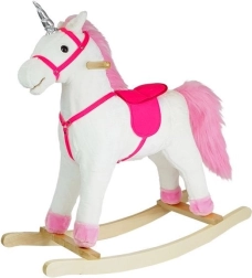 Przy głowie jednorożca znajdują się drewniane rączki, które zapewniają pewny chwyt i bezpieczną zabawę. Siodło wyposażone jest w wygodne strzemiona.