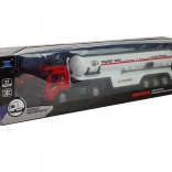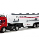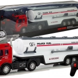 Przedstawiamy zdalnie sterowaną cysternę, która daje dzieciom możliwość odkrywania świata pojazdów budowlanych w komfortowych warunkach zabawy. Pojazd jest wyposażony w plastikowe, bieżnikowane koła, co pozwala na używanie go na różnych nawierzchniach. Czerwona kabina z białą zabudową, uzupełniona kontrastującymi czarnymi detalami i charakterystycznymi naklejkami, nadaje realistyczny wygląd.