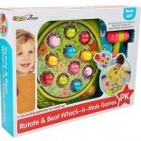 Kiedy tarcza się zatrzyma, gra się kończy. Zlicz trafienia i przekaż młotek kolejnemu graczowi. O wygranej decyduje większa liczba trafionych kretów! Szybsze tempo oznacza większe wyzwanie. Całości towarzyszy wesoła muzyka.