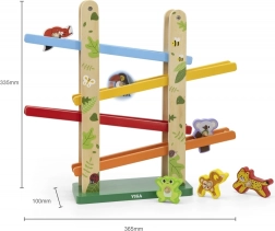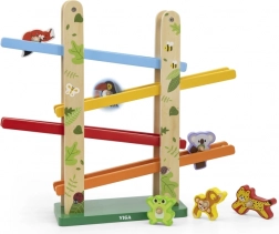 Drewniana zjeżdżalnia dla zwierzątek Jungle Slider marki VIGA została zaprojektowana tak, aby jednocześnie bawić i edukować dzieci. Dzięki wysokiej jakości wykonania i kolorowym elementom zabawka zapewnia wciągające wrażenia z zabawy. Zwierzątka mogą zjeżdżać po czterech poziomach rampy, co rozwija koordynację oraz małą motorykę.