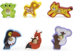 W zestawie znajduje się sześć drewnianych figurek zwierząt, które rozwijają wyobraźnię i umiejętności motoryczne.