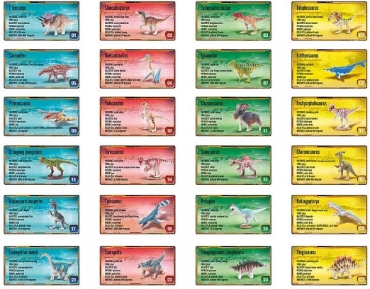 - 1 figurka dinozaura (mix gatunków) + karta postaci