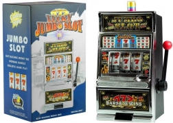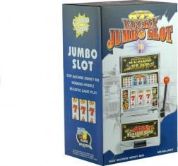 Jak działa automat Jumbo? Wystarczy, że mały gracz umieści monetę we właściwym miejscu i pociągnie za dźwignię umieszczoną z boku automatu. Gdy urządzenie ruszy, zaczną się obracać trzy bębny z motywami charakterystycznymi dla kasyna. Jeśli kombinacja symboli okaże się właściwa, z automatu wypadną pieniądze – jeśli nie, dziecko otrzyma je z powrotem przy kolejnej próbie szczęścia. Monety można też wyjąć z automatu niezależnie. Zabawa nie jest jedyną funkcją tego urządzenia – w dużej zabawce ukryta jest skarbonka. Z tyłu automatu znajduje się otwór na monety, dzięki czemu dziecko może rozsądnie gospodarować swoją wygraną.