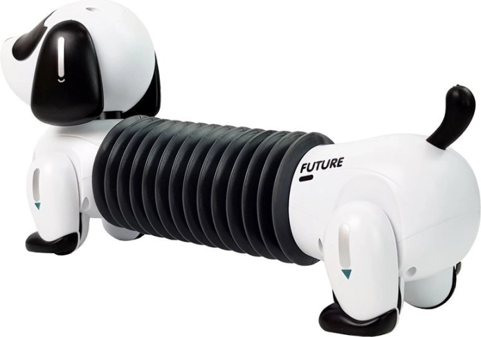 Robotyczny pies to projekt przyszłości z naciskiem na nowoczesne technologie. Jego czarno-biały wygląd z efektem harmonijki zapewnia mobilność i elastyczność.