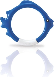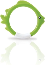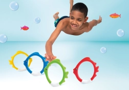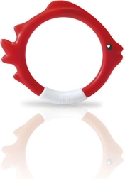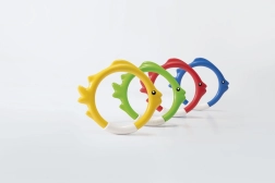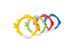 Zabawny zestaw czterech pierścieni do nurkowania w kształcie rybek dla dzieci od 6 lat. Pierścienie w kolorach niebieskim, czerwonym, zielonym i żółtym po wrzuceniu do wody stabilnie ustawiają się na dnie, co motywuje do treningu nurkowania i poprawia umiejętności pływackie. Wykonane z miękkiego i bezpiecznego materiału dla łatwego chwytu.