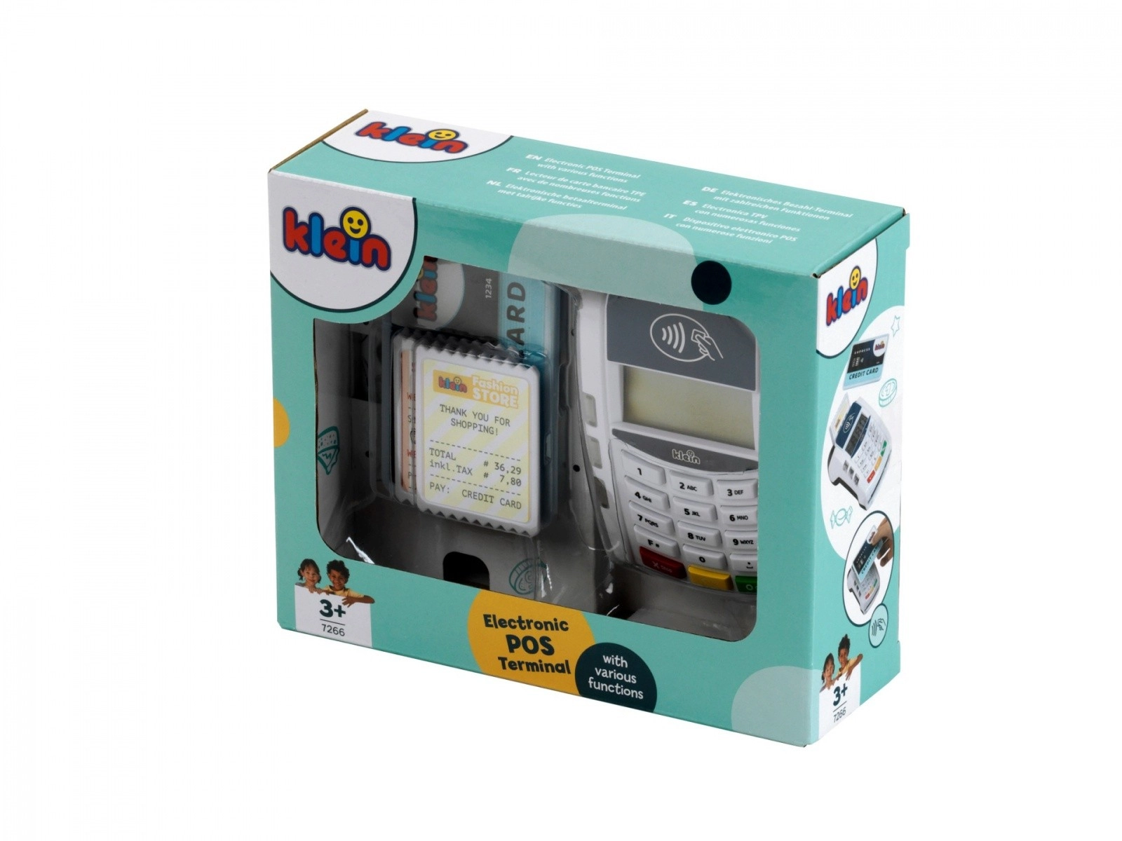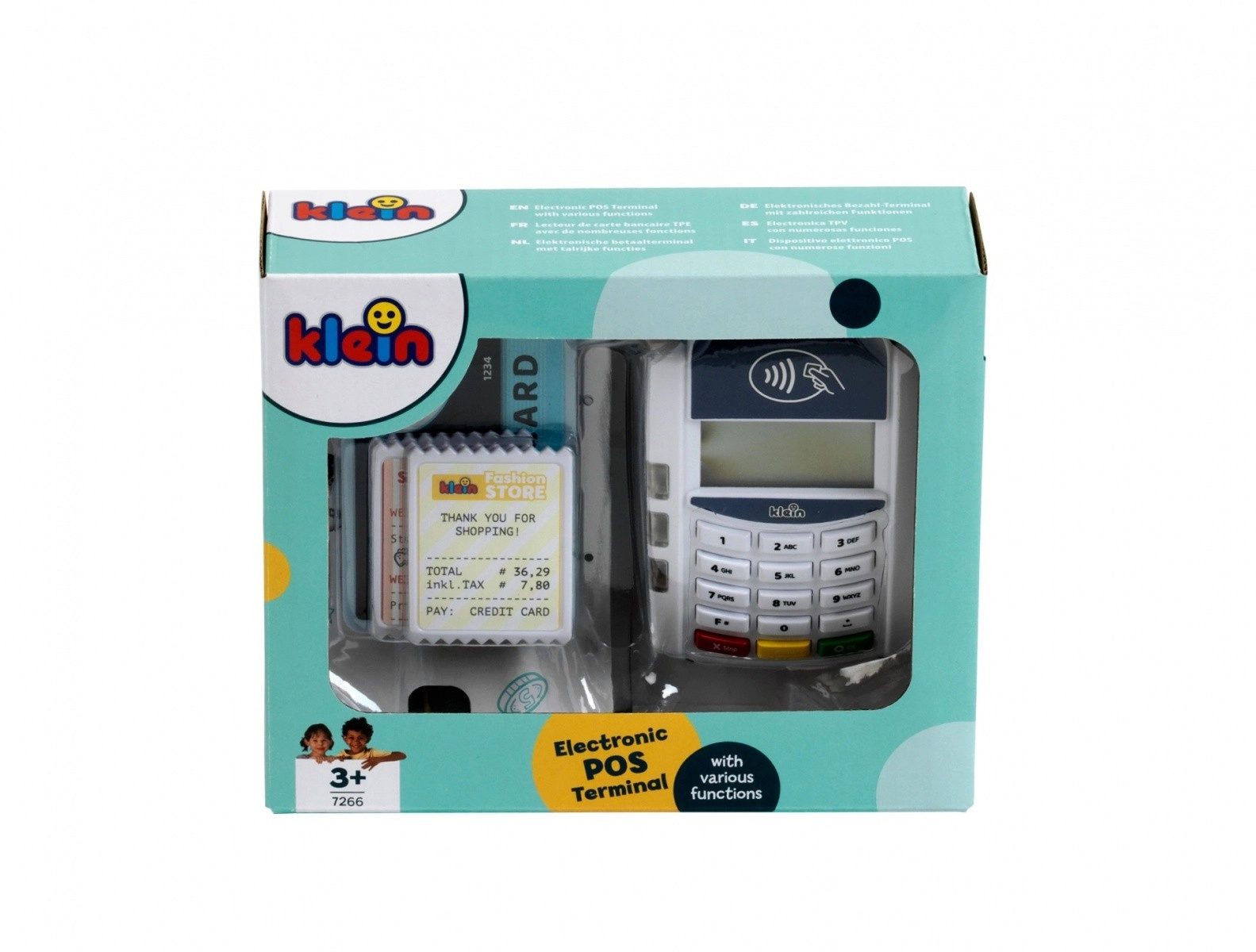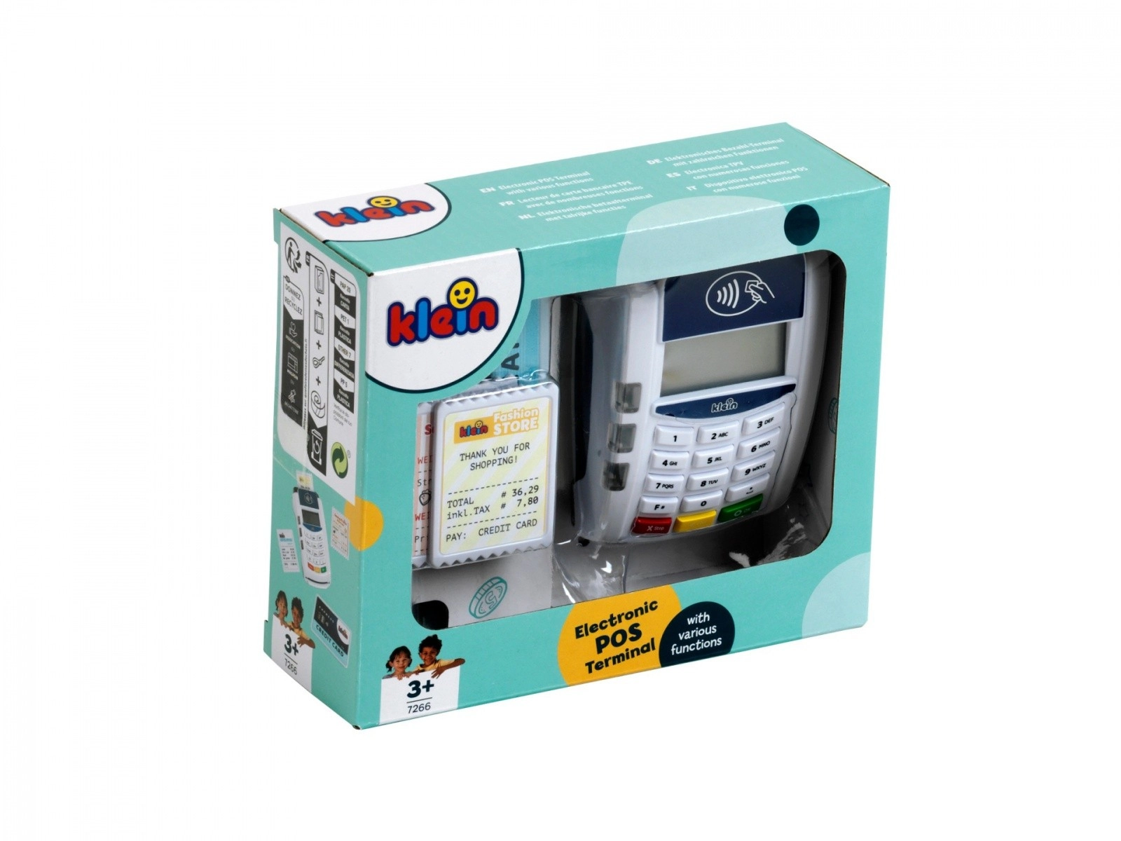 Terminal płatniczy stworzony przez firmę Klein jest w kolorze białym i niebieskim z białym panelem klawiatury. Zabawka wykonana jest z wysokiej jakości plastiku i ma wiele funkcji, które zainteresują każdego właściciela małego sklepiku. Ten zabawkowy dodatek kasowy wnosi do dziecięcego pokoju powiew nowoczesnych technologii. Płatności bezdotykowe stają się tu formą zabawy, ale także elementem edukacyjnej rzeczywistości.