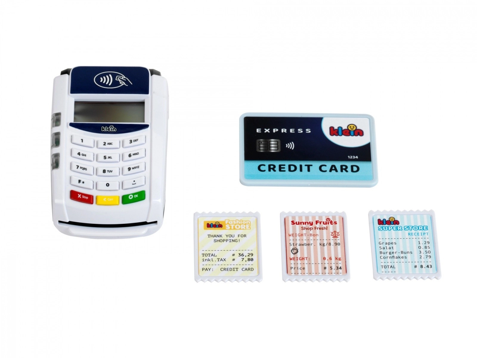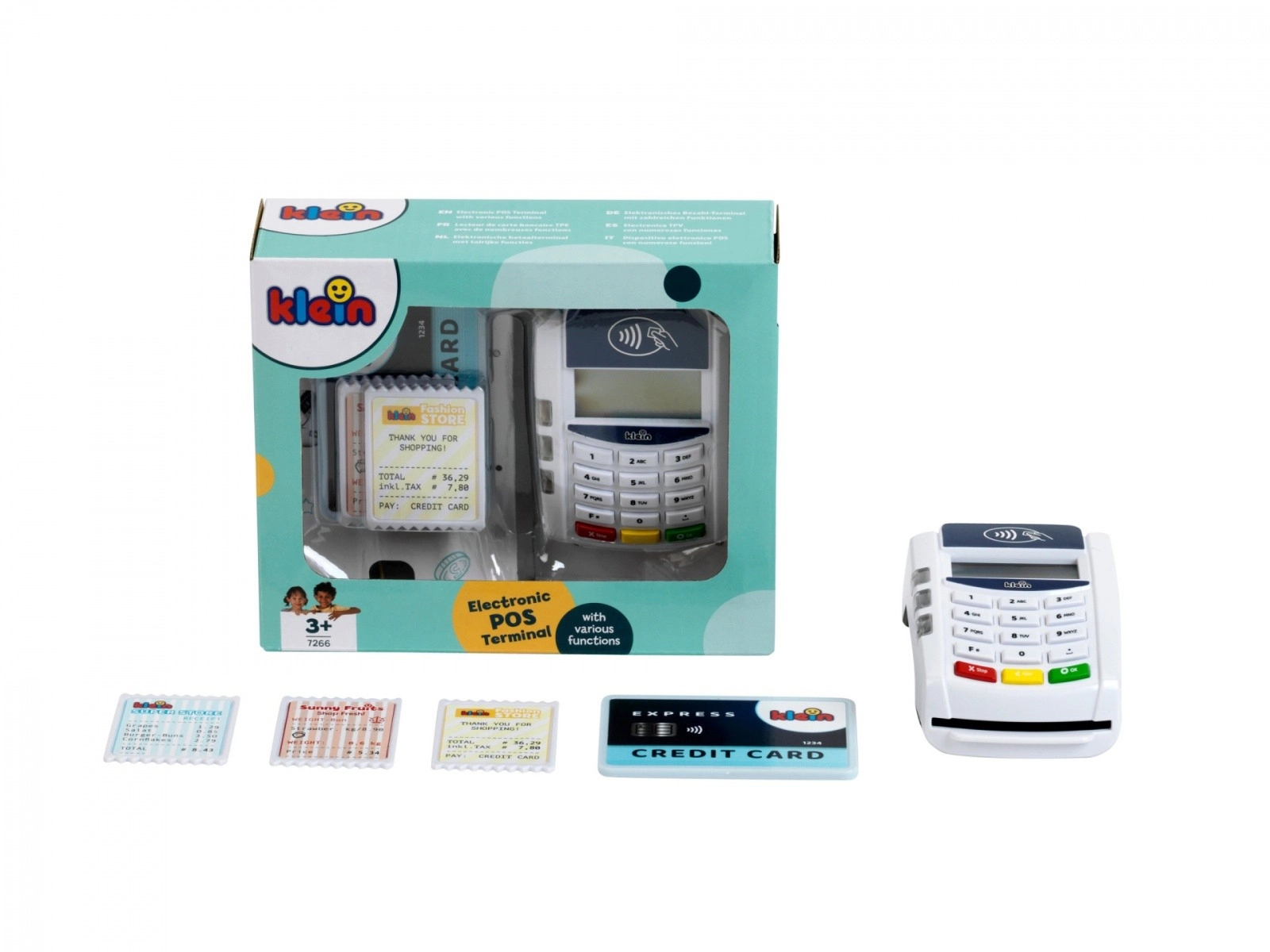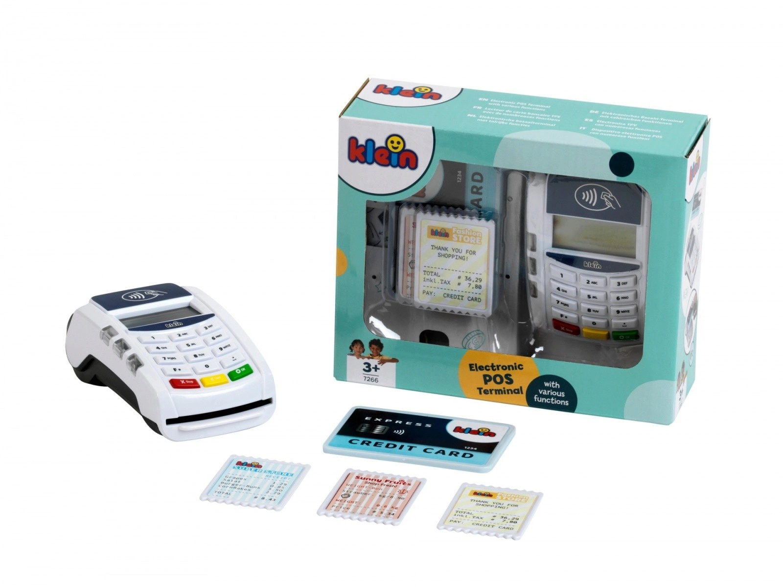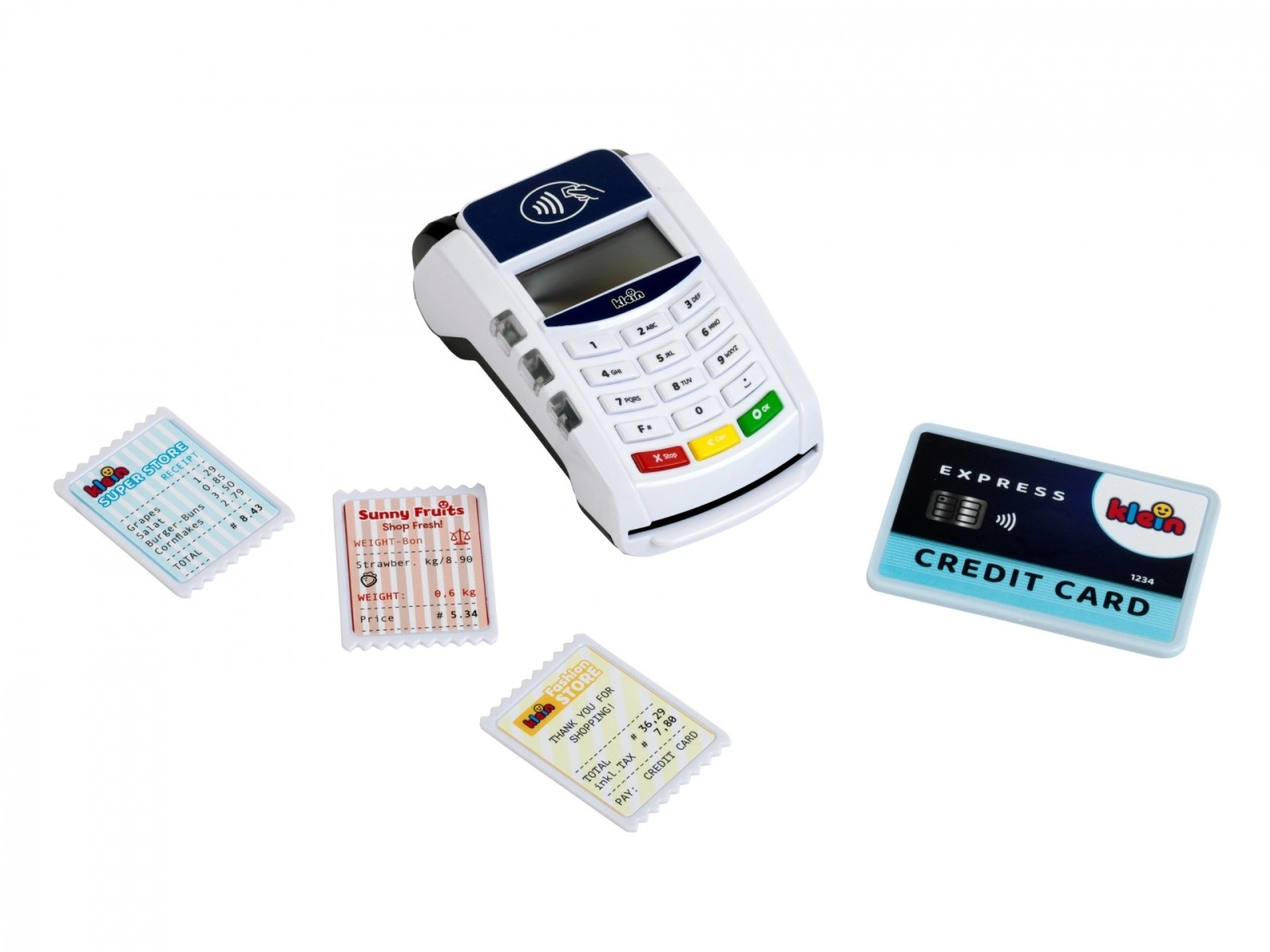 Terminal płatniczy stworzony przez firmę Klein jest w kolorze białym i niebieskim z białym panelem klawiatury. Zabawka wykonana jest z wysokiej jakości plastiku i ma wiele funkcji, które zainteresują każdego właściciela małego sklepiku. Ten zabawkowy dodatek kasowy wnosi do dziecięcego pokoju powiew nowoczesnych technologii. Płatności bezdotykowe stają się tu formą zabawy, ale także elementem edukacyjnej rzeczywistości.