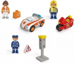 Odkryj zabawny zestaw dla najmłodszych z figurkami ratowników, policjanta i strażaka na motocyklu. Dzieci ćwiczą wyobraźnię, małą motorykę oraz podstawy wychowania komunikacyjnego dzięki sygnalizacji świetlnej ze zmianą kolorów, autu ratunkowemu z hakiem i motocyklowi z grzechoczącym efektem.