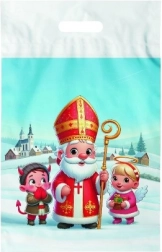 Ozdobna torba foliowa z nadrukiem Mikołaja, anioła i diabła jest idealna do pakowania mikołajkowych upominków. Rozmiar 29×46 cm zapewnia wystarczająco dużo miejsca na słodycze, zabawki i większe prezenty, a wyrazisty, radosny motyw sprawi wiele radości.