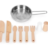Stojak na noże, haczyki na akcesoria oraz zestaw dodatków (noże, sztućce, łopatki, sól/pieprz, rondel) uczą dzieci porządku i rozwijają motorykę.