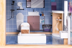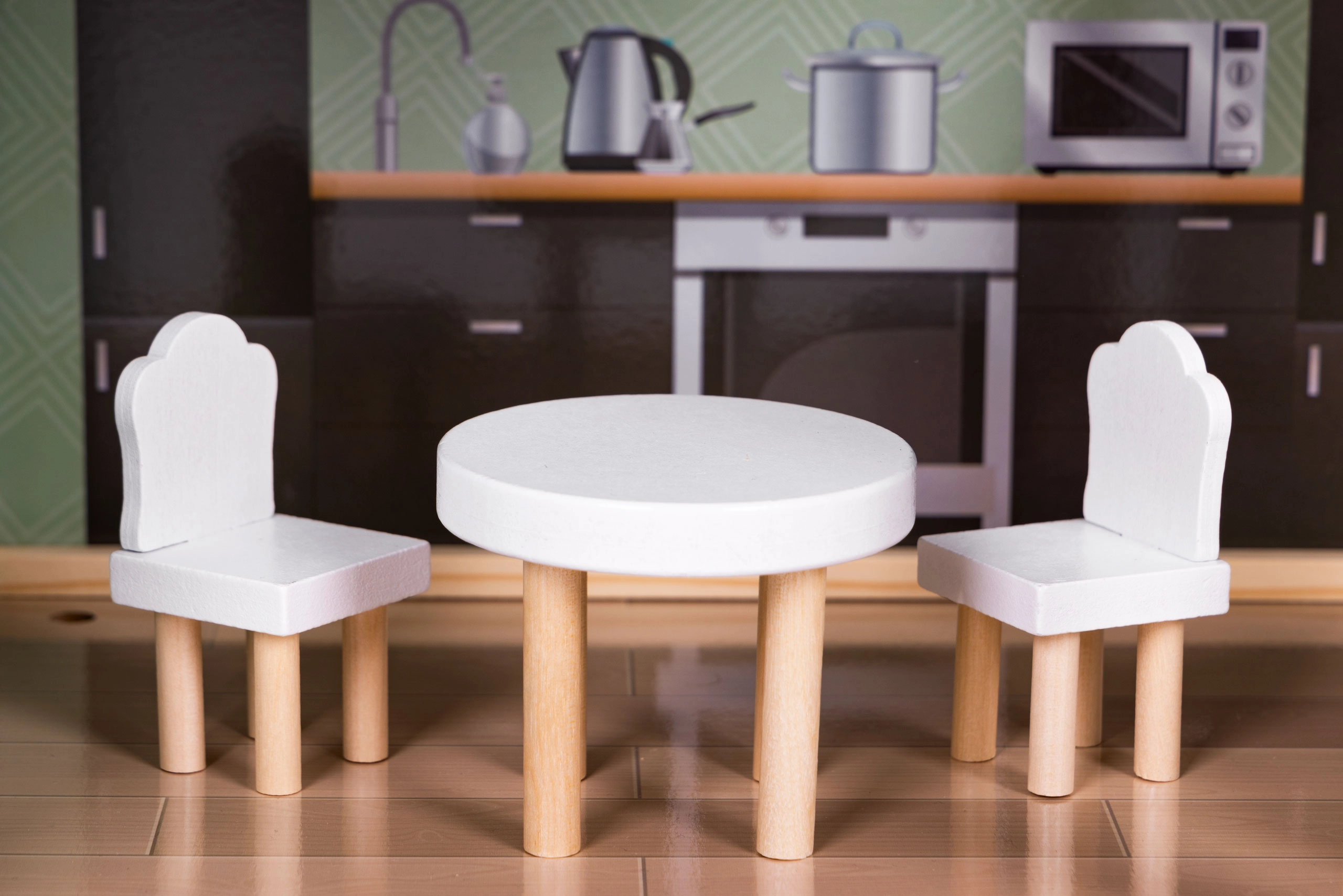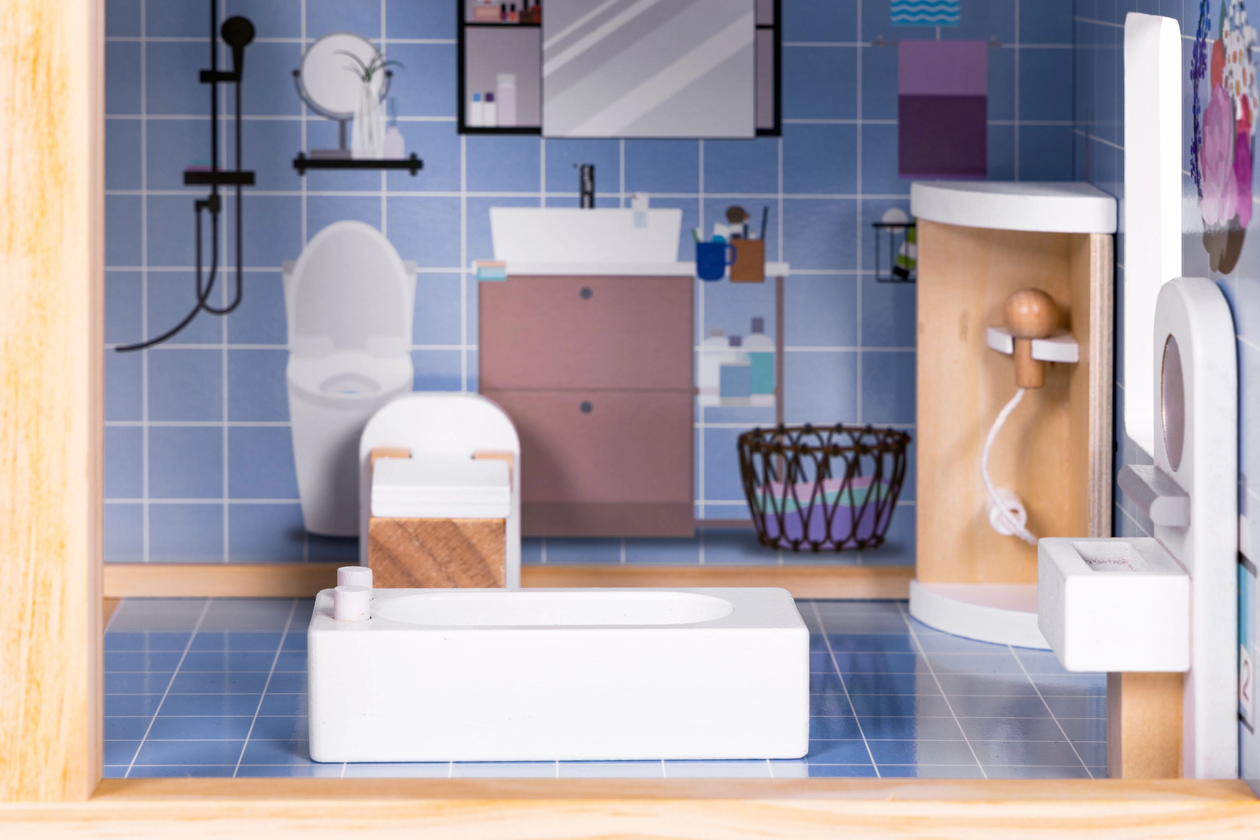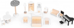 W zestawie znajduje się także komplet 15 drewnianych elementów mebli, które można dowolnie wyjmować i przestawiać bez żadnych ograniczeń.