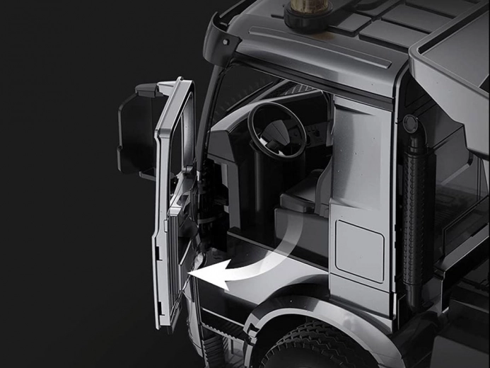 Ta dopracowana RC wywrotka Mercedes‑Benz AROCS zapewnia maksymalnie realistyczne wrażenia: oryginalny grill z logo, wiernie odwzorowana kabina z otwieranymi drzwiami oraz efektowne światła i dźwięki silnika, kierunkowskazów i cofania. Metalowa skrzynia i mechanizm podnoszenia nadają zabawce trwałość i autentyczność.