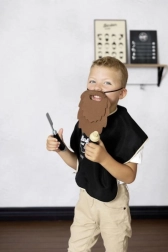 - Filcowe wąsy, peleryna, maszynka do golenia, buteleczka z pianką, ręcznik
