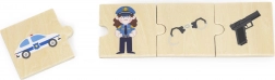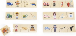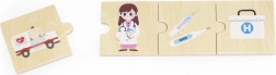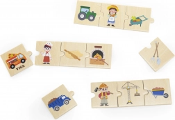 Dzieci dopasowują postacie (strażak, lekarz, policjant, rolnik, budowlaniec, piekarz) do odpowiednich narzędzi i pojazdów, a przy tym naturalnie poszerzają słownictwo.