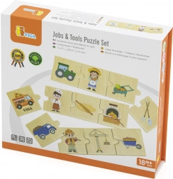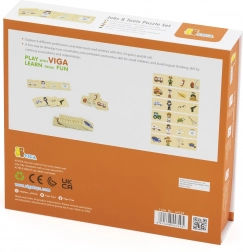 Edukacyjny zestaw VIGA zawiera 24 drewniane elementy z pięknymi ilustracjami, dzięki którym dzieci w formie zabawy poznają 6 zawodów – na przykład strażak, lekarz, policjant, rolnik, budowlaniec czy piekarz – i dopasują do nich właściwe narzędzia oraz pojazdy. Kolorowe obrazki wspierają naukę nowych słów i poszerzają słownictwo.