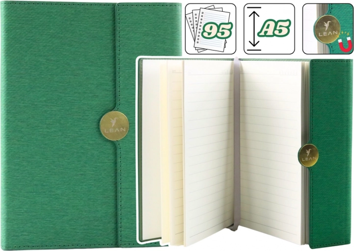 Zachowaj porządek w codziennych zadaniach ze stylowym zielonym notesem A5. Twarda okładka z magnetycznym zapięciem trzyma wszystko bezpiecznie, dzięki czemu Twoje notatki są chronione w torbie i na biurku. Liniowane strony z datą i dniami tygodnia pomagają planować i szybko wracać do ważnych informacji.