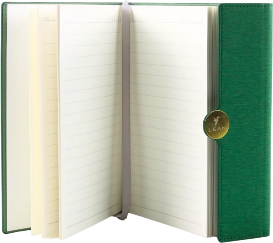 Solidna, wytrzymała okładka w zielonym kolorze chroni zawartość i nadaje notesowi profesjonalny styl do codziennego użytku.