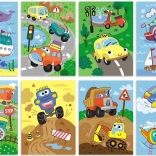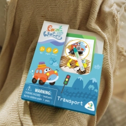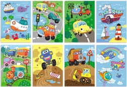 Wesołe ilustracje samochodów, pociągów, statków i samolotów wspierają poznawanie świata transportu i rozwijają słownictwo.