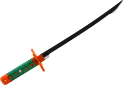 Czarna klinga i wyrazista pomarańczowo‑zielona rękojeść z geometrycznym wzorem nadają mieczowi autentyczny styl. Lekki plastik doskonale sprawdza się w dziecięcej zabawie i ułatwia manewrowanie.