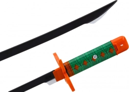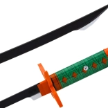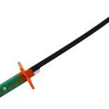 Ten samurajski miecz dla dzieci wiernie naśladuje legendarny styl nichirin – ma czarną klingę oraz pomarańczowo‑zieloną rękojeść z geometrycznym wzorem zapewniającym pewny i wygodny chwyt. Bezpieczne plastikowe ostrze o długości ok. 40 cm oraz rękojeść ok. 15 cm wspierają bezpieczną i kreatywną zabawę.