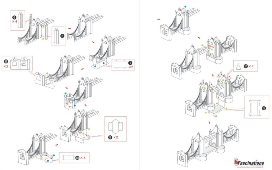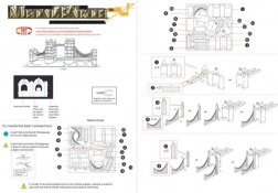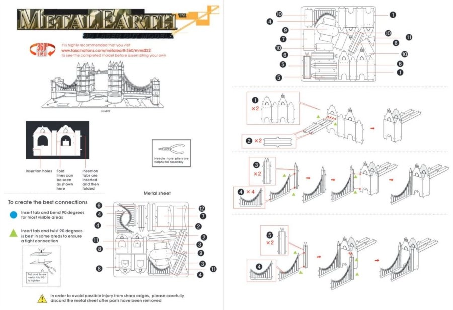 Poszczególne elementy wyjmij z metalowych arkuszy; w razie potrzeby użyj małych cęgów tnących (nie dołączonych). Elementy łączy się ze sobą za pomocą zamków tworzonych przez zaczep (języczek) i otwór. Zagiń języczek przy użyciu małych, cienkich szczypiec (nie dołączonych) i stopniowo połącz wszystkie zamki, aż powstanie bardzo realistyczne, mistrzowskie dzieło!