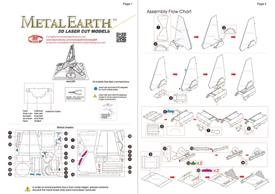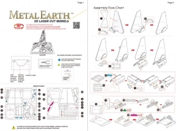Wyjmij poszczególne elementy z metalowych arkuszy; w razie potrzeby użyj małych cążek tnących (nie są dołączone). Elementy łączy się za pomocą zamków tworzonych przez zaczep (języczek) i otwór. Zegnij języczek przy użyciu małych, cienkich szczypiec (nie są dołączone) i stopniowo połącz wszystkie zamki, aż powstanie bardzo realistyczne, mistrzowskie dzieło!