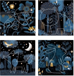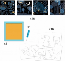 W opakowaniu znajdziesz wszystko, co potrzebne: 16 ilustrowanych teł, 16 szablonów, igłę do dziurkowania, solidny uchwyt oraz ilustrowaną broszurę z instrukcjami. Materiały wykonane są z papieru i kartonu z certyfikatem FSC, więc tworzenie jest nie tylko kreatywne, ale i przyjazne dla przyrody.