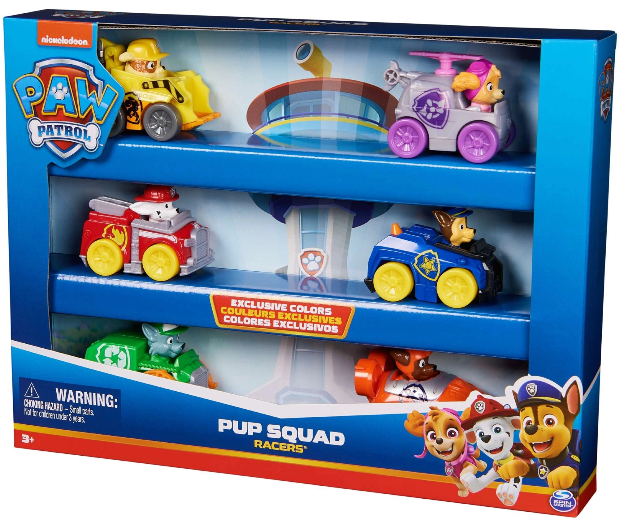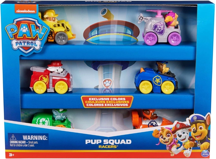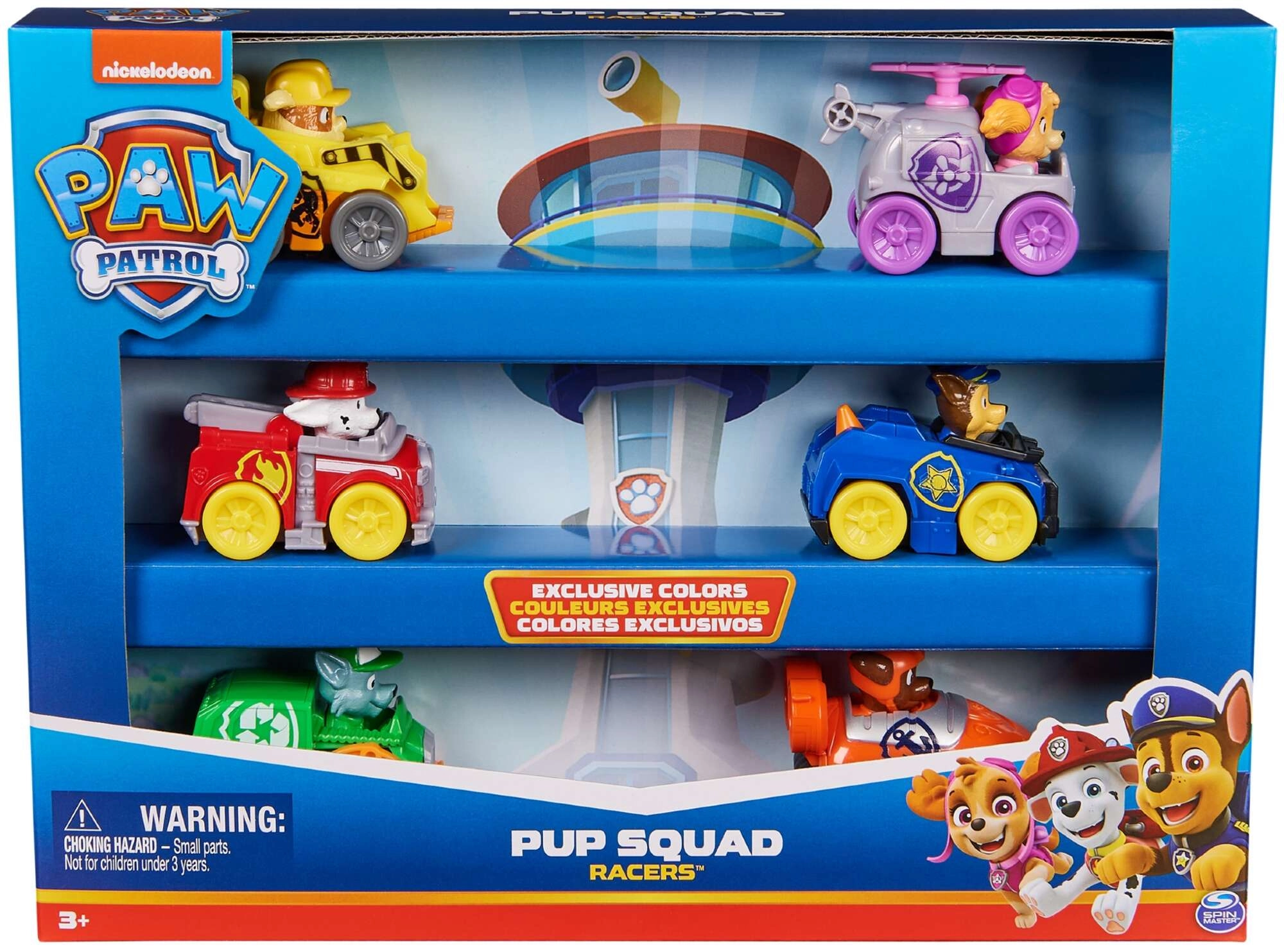 Zestaw Pup Squad Racers oferuje sześć szczegółowo wykonanych pojazdów z na stałe osadzonymi figurkami bohaterów PAW Patrol – Chase'a, Marshalla, Skye, Rocky'ego, Rubble'a i Zumy. Autka są wykonane z wytrzymałego plastiku, mają napęd na pchnięcie i dzięki niewielkim rozmiarom są łatwe w prowadzeniu i przenoszeniu.