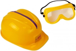 Żółty kask i przezroczyste okulary zapewniają symulację ochrony dla bezpiecznej i realistycznej zabawy.