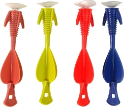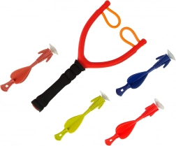 Zestaw zawiera czerwoną procę oraz cztery kolorowe pociski z przyssawkami dla bezpiecznej zabawy.