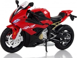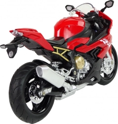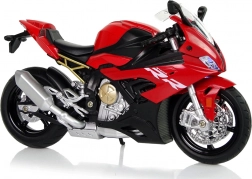 Model BMW S1000RR został wykonany w czerwonym kolorze, każdy detal, jak na przykład łańcuch podwozia, został odwzorowany z maksymalną starannością. Każdy miłośnik motocykli będzie zachwycony. Naciśnięcie tylnej części motocykla aktywuje dźwięki i przednie światła, ruchoma kierownica umożliwia skręcanie podczas zabawy, a gumowe opony dobrze trzymają się podłoża. Motocykl będzie wyglądał doskonale na półce dzięki wysuwanej podpórce.