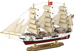 Ten model kolekcjonerskiego statku *Sorlandet* stanowi doskonałą replikę tradycyjnego żaglowca. Drewniana podstawa z nazwą statku dodaje autentyczności, a norweska flaga na szczycie podkreśla jego pochodzenie.